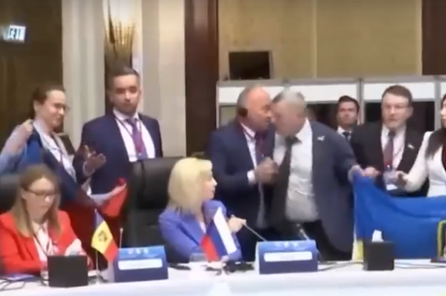 Уже после заседания произошла потасовка. Депутат Госдумы Ольга Тимофеева давала комментарий в эфире российской программы «60 минут», когда у нее за спиной возник народный депутат из Украины Александр Мариковский с украинским флагом и стал выкрикивать проукраинские лозунги. Сотрудник международного управления Госдумы Валерий Ставицкий вырвал флаг из рук нардепа, но ненадолго — Мариковский напал на него и отобрал полотнище. Ставицкому потребовалась медицинская помощь, сообщило российское посольство.
